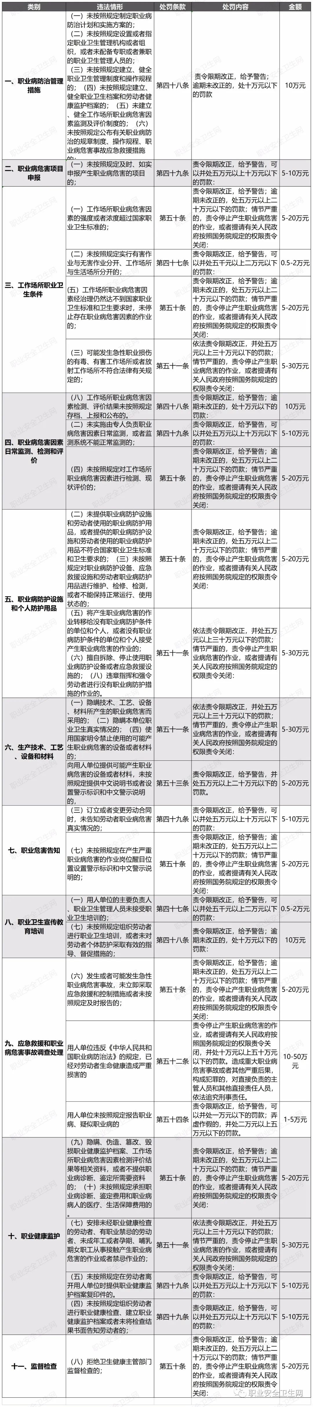中用人单位职业卫生违法情形对应处罚内容如下表: